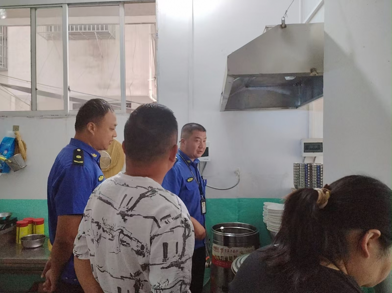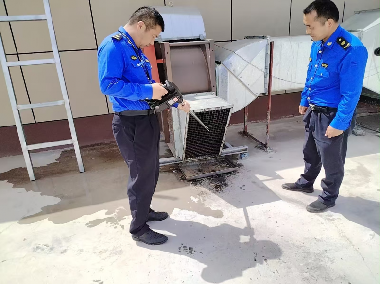 动态巡查,筑牢“保障墙”。 高考期间,“动态清零”成为中队工作第一要务。一大早,队员们的身影就出现在早餐店厨房后巷,检测仪紧贴净化设备排口,数据闪烁间一切了然;正午骄阳炙烤,他们依然坚守岗位,对考点周边午餐供餐单位进行二次巡查,严防油烟净化设备因瞬时高峰运转不畅;夜幕降临,当最后一场考试结束的铃声散去,他们仍未停歇——对烧烤、夜市等油烟产生“大户”的巡查持续至深夜,严防问题反弹。多日来,中队累计出动巡查人员近百人次,检查餐饮场所近两百家次,即时整改隐患数十起,坚持以脚步丈量责任,将油烟扰民风险扼杀于萌芽。